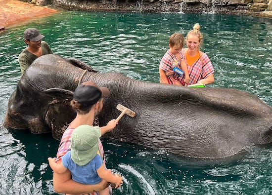 The practice of charging tourists to clean elephants is big business in Southeast Asia. Thai tourist facilities alone hold some 2800 elephants captive.